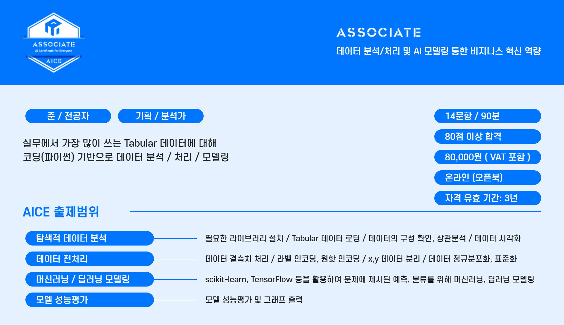 - AI 문해력, 데이터 분석, 모델링 등 실무 중심의 AI 활용 능력을 검증.