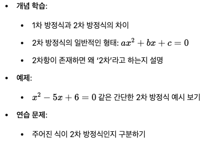이 커리큘럼을 따라가면 2차 방정식의 개념부터 풀이까지 확실하게 익힐 수 있을 거예요! 😊