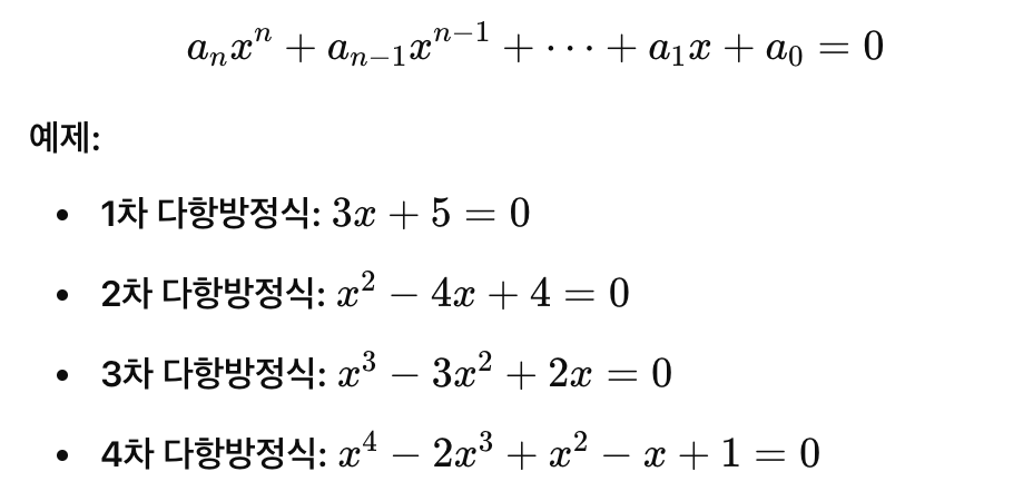 다항방정식은 다항식을 포함하는 방정식으로, 일반적으로 다음과 같은 형태를 가집니다.
