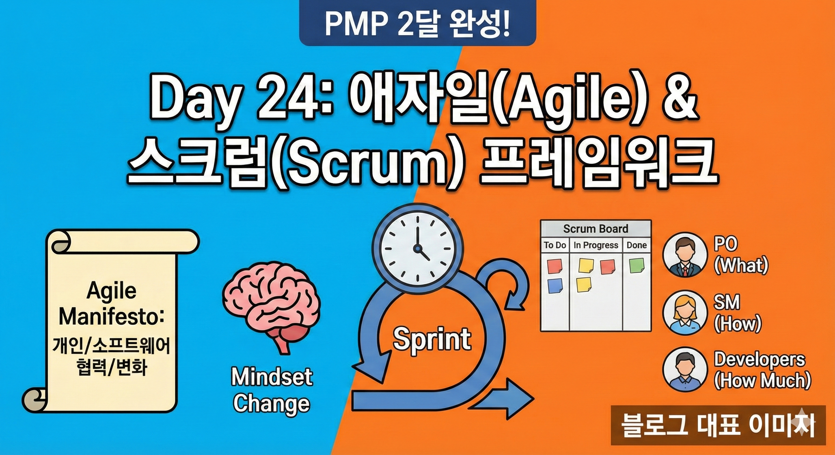 축하합니다! 어제로 10대 지식 영역(프로세스 중심)을 모두 마스터하셨습니다. 오늘부터 Day 24 (4주차 4일), PMP 시험의 50%를 차지하는 '애자일(Agile) 및 하이브리드' 영역으로 진입합니다.