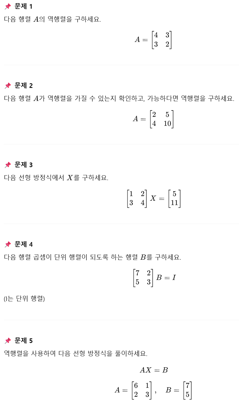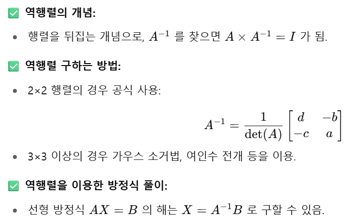 역행렬은 정사각 행렬(n × n 행렬)에 대해 정의되며, 선형 방정식의 해를 찾는 데 중요한 역할을 합니다.