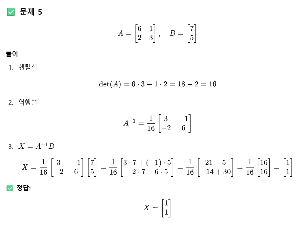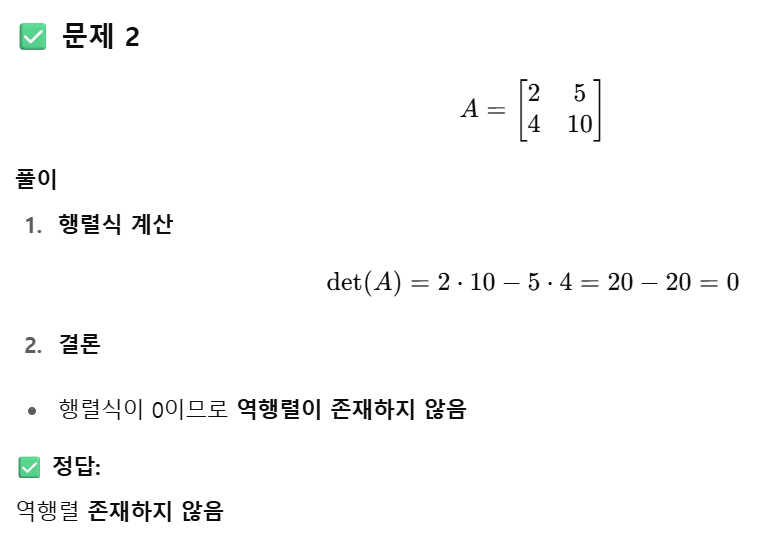 - 행렬식이 0이면 역행렬이 존재하지 않습니다.